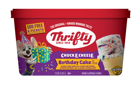 “As the top destination for birthdays globally, partnering with Thrifty Ice Cream to create an exclusive Birthday Cake flavor was a natural fit to capture the fun and excitement of celebrations at our Chuck E. Cheese entertainment centers,” said Melissa McLeanas, Chuck E. Cheese Vice President of Global Licensing, Media & Entertainment. “We’re proud to share this new flavor with families to enjoy their celebration at home or in our fun centers in a whole new way.”