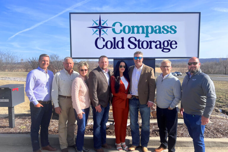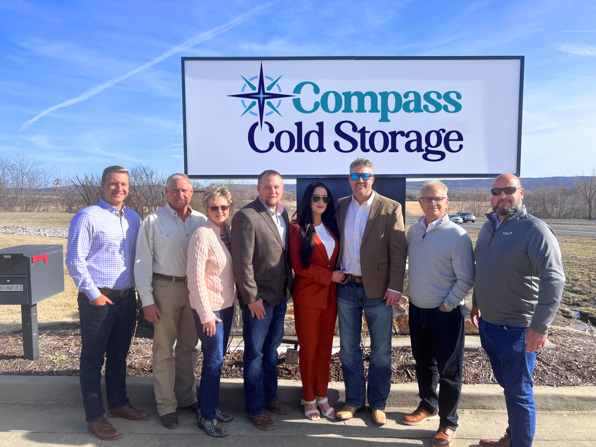 Compass Cold, a new public refrigerated warehousing (PRW) company based in Mulberry, Arkansas, has announced plans for the construction of a 70,000-square-foot cold storage facility near Fort Smith. It is being designed and will be built by Melbourne, Florida-headquartered Ti Cold. Members of each company meeting recently to officially kick off the project are pictured above (left to right: Logan Stuller, Jeff and Debbie Winstead, Darren Winstead, Candice and Doug Bowen, Rob Adams and Sam Tippmann).