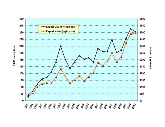 Shipments to other important markets included Cuba, 110,757 tons, down 1%; China, 104,113 tons, up 59%; Iraq, 120,613 tons, up 23%; Taiwan, 68,099 tons, down 31%; Georgia, 59,550 tons, up 1%; and Guatemala, 59,082 tons, up 14%.