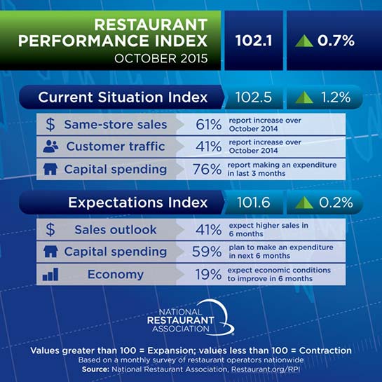 Driven by stronger same-store sales and a more optimistic outlook among restaurant operators, the National Restaurant Association’s Restaurant Performance Index (RPI) posted a moderate gain in October of 2015. The RPI – a monthly composite index that tracks the health of and outlook for the restaurant industry in the United States – stood at 102.1 in October, up 0.7 percent from a level of 101.4 in September. In addition, October represented the 32nd consecutive month in which the index stood at above 100, which signifies expansion in the index of key industry indicators.