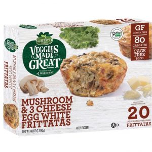 • Mushroom & 3 Cheese Egg White Frittata. Made with egg whites and distributed in a 1.13kg package containing 20 pieces, the filling is loaded with mushroom, cauliflower, kale and cheese (80 calories and 4 grams of protein.