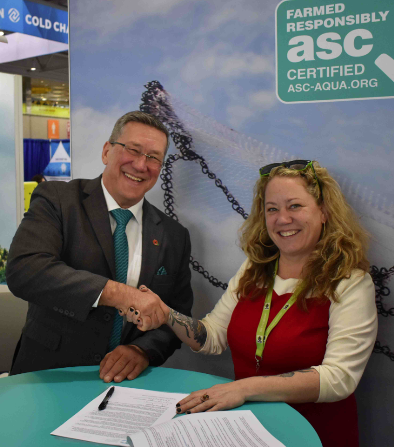 ASC CEO Chris Ninnes and Fair Trade USA Director Julie Kuchepatov sign a memo of understanding pertaining to the two-year aquaculture improvement project in Indonesia.