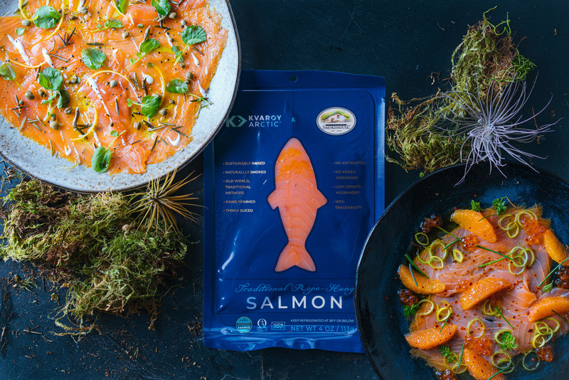 Since its launch in March of 2020, the Indre Kvarøy, Norway-based company has supplied frozen and fresh sustainably-raised Atlantic salmon to Whole Foods Market locations throughout the United States. Last October it introduced a line of cold smoked salmon co-branded with Santa Barbara Smokehouse. Carefully rope hung and smoked using wood chips from the Santa Barbara area, the artisanal technique preserves the delicate taste and tender texture of Kvarøy Arctic fish, resulting in smoked salmon with vegetative notes, natural citrus flavor and a buttery finish on the palate.