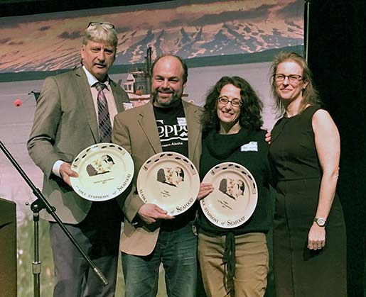Marc Wheeler and Jessica Paris (in the middle) accept three awards for Coppa Candied Salmon Ice Cream, including the Grand Prize, in the 2017 Alaska Symphony of Seafood competition. On hand to congratulate the winners are Chris Hladick (far left), State of Alaska Commissioner of Commerce, and Julie Decker (far right), executive director of the Alaska Fisheries Development Foundation.